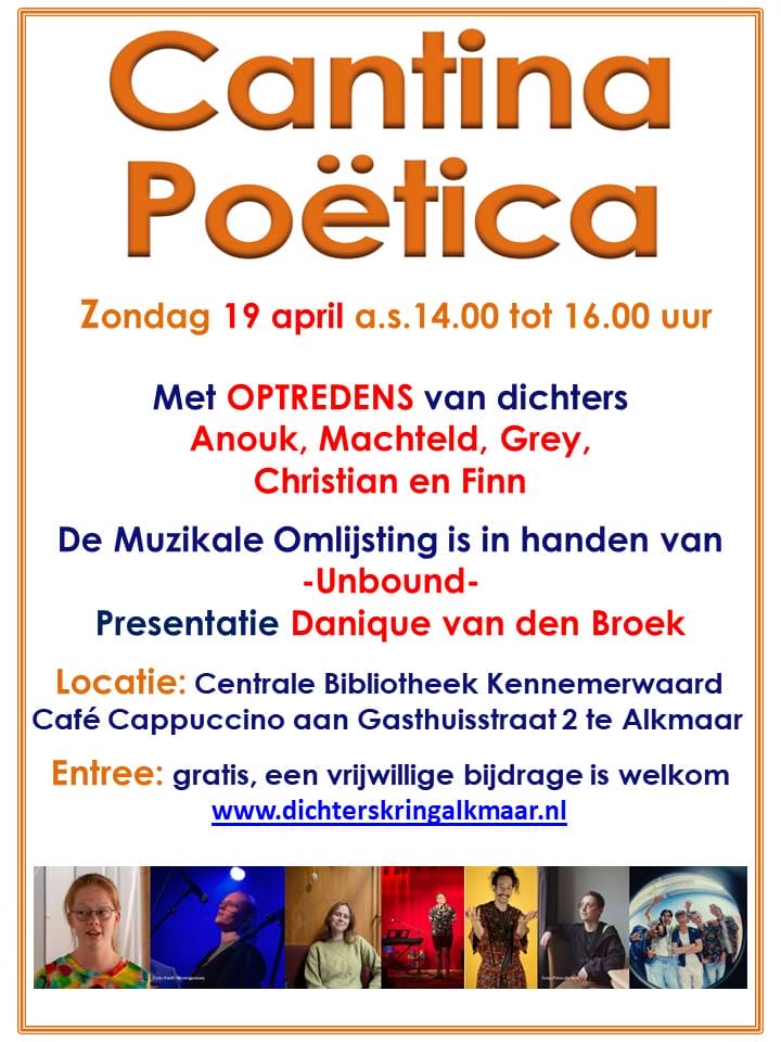 Zondag 19 april verandert de bibliotheek aan de Gasthuisstraat in een bruisend podium. Tijdens Cantina Poëtica nemen jonge dichters, dansers en muzikanten de ruimte over met een middag vol woord, beweging en muziek.